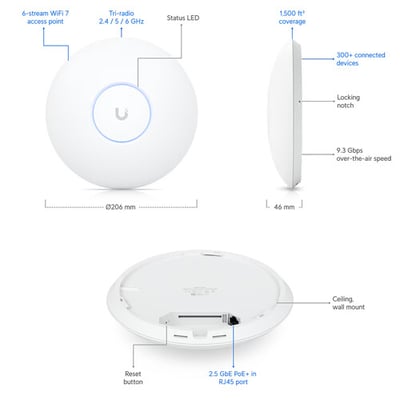 Ceiling-mounted WiFi 7 AP with 6 spatial streams and 6 GHz support for interference-free WiFi in demanding, large-scale environments.