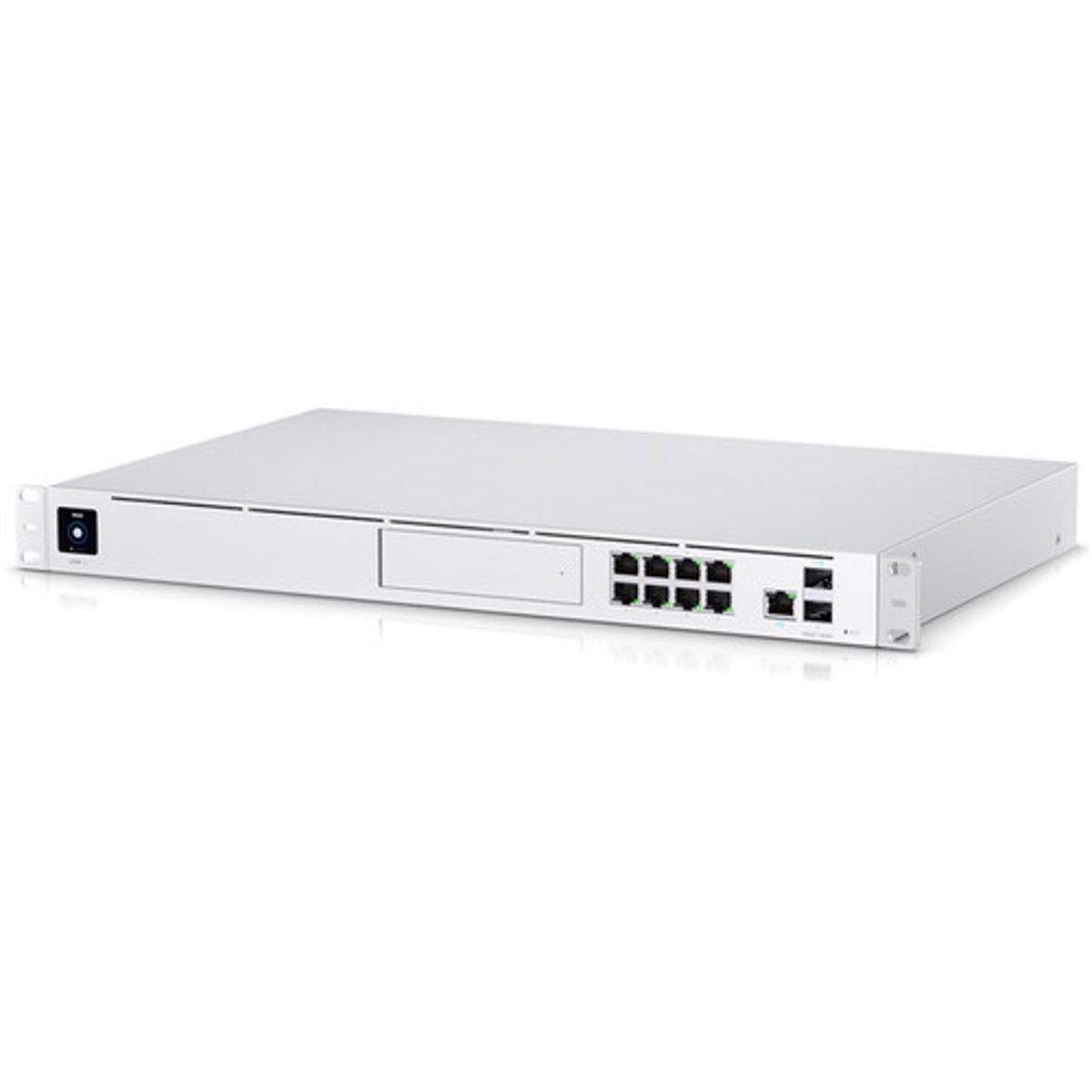 Streamline your small to medium business network with the UniFi Dream Machine Pro. The enterprise-class network device integrates a security gateway, 10G SFP+ WAN, an eight-port Gigabit switch, and 2.5" / 3.5" hard drive support into a single 1U rack appliance for UniFi Controllers. Powered by a 1.7 GHz ARM Cortex-A57 Quad-Core processor, 4GB of memory, and 16GB of onboard eMMC flash storage, the security gateway offers an intrusion detection and protection system with a 3.5 Gb/s max throughput rate. The eight-port RJ45 managed switch has a 10 Gb/s SFP+ LAN port available for network expansion and supports advanced Layer 2 features. A 1.3" touchscreen displays the device's status for easy monitoring and troubleshooting. Additionally, the integrated UniFi Protect controller automatically detects attached security cameras, and you can access up to 20 live camera feeds, network statistics, and more from a centralized interface. Video surveillance recordings may be stored onto an off-the-shelf 2.5" or 3.5" hard drive that you install into the built-in bay.